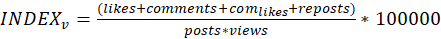 В зарубежной научной традиции широкое распространение получил трёхкомпонентный индекс вовлечённости, предложенный Е. Бонсон и М. Раткай [14], в котором вычисляется среднее количество интерактивных действий (реакций, комментариев, репостов) на одну публикацию на стене сообщества, отнесённое к каждой тысяче подписчиков. Существенным достоинством данной модели является учёт как интенсивности публикационной активности администрации, так и масштаба охвата целевой аудитории, поскольку оба эти аспекта оказывают непосредственное влияние на уровень обратной связи от населения.